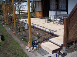 Auf Splitt verlegte Terassenplatten in umlaufender Metalleinfassung.
