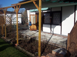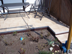 Auf Splitt verlegte Terassenplatten in umlaufender Metalleinfassung.